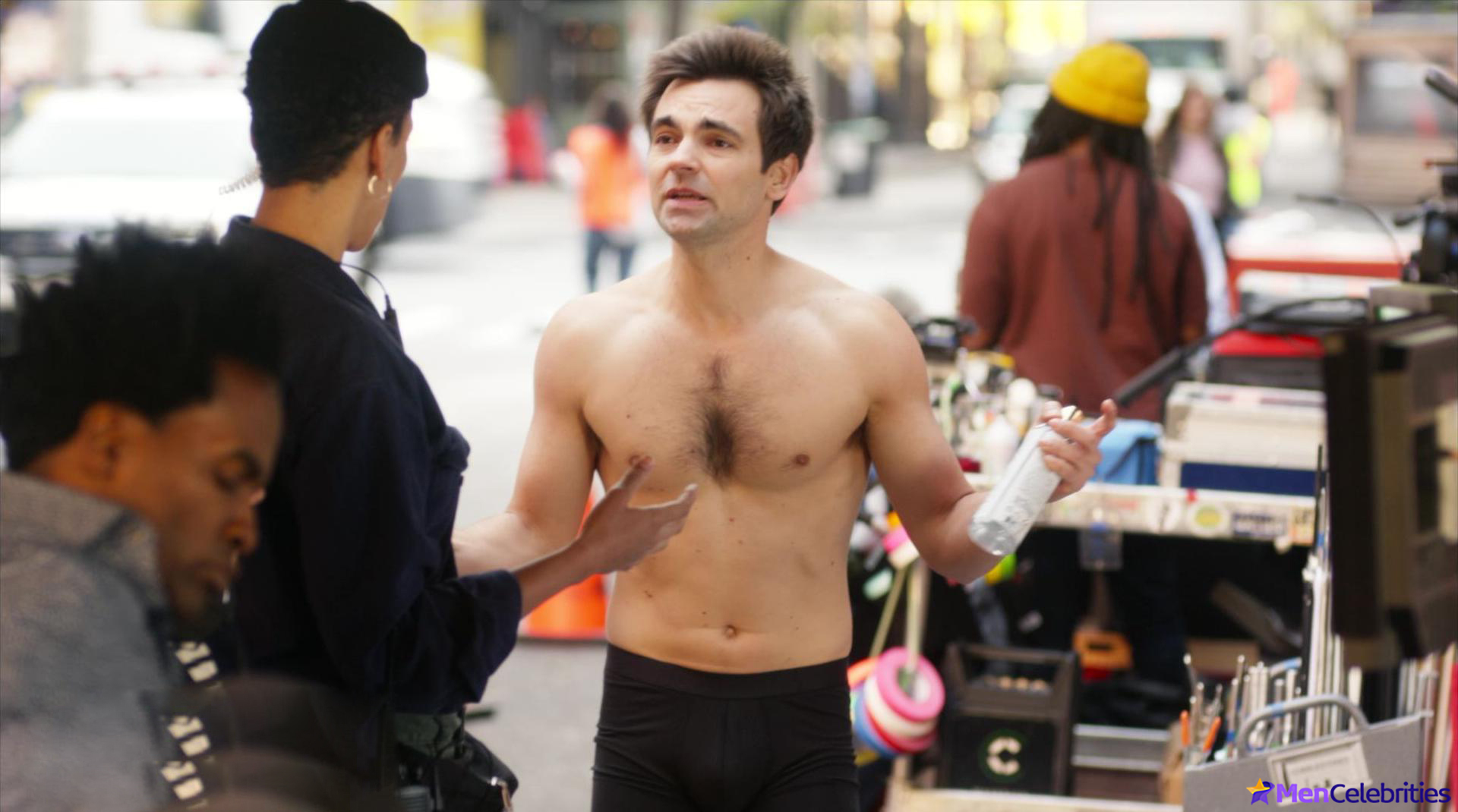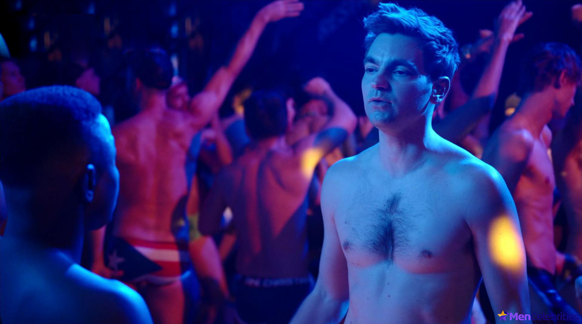 It was no problem for this male celebrity to meet a guy at a party. And they quickly went from talking to kissing! Drew Tarver also showed off his nude hairy chest while on a TV show.